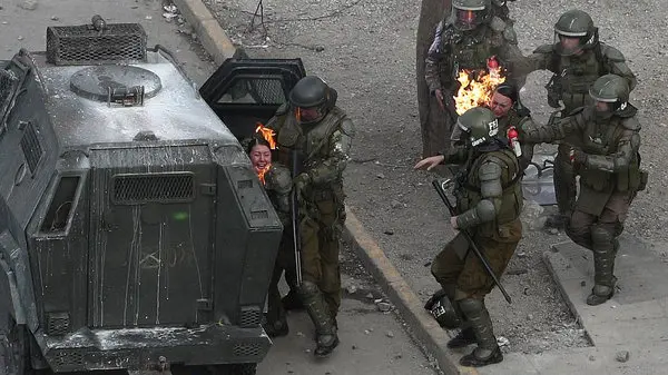 در یکی از صحنه های درگیری پرتاب کوکتل مولوتف از سوی معترضان به نیروهای پلیس منجر به آسیب دیدن دو تن از آنان شد. دو نیروی پلیس زن شیلی در سانتیاگو پس از پرتاب کوکتل مولوتف دچار آتش سوزی شدند.