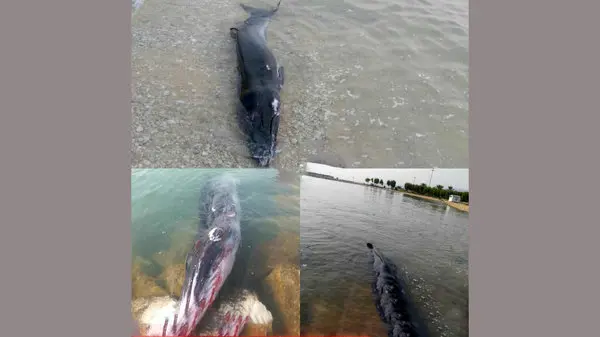 رکنا : بچه نهنگی که به دلیل آلودگی های زیست محیطی وارد بخش کم عمق ساحل شده بود توسط کارمندان هتلی در عسلویه از مرگ نجات یافت.