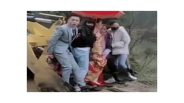 از قرار معلوم، داماد عاشق چینی که در روز مراسم عروسی اش متوجه بارش باران شدید و گل و لای زمین شد برای نجات عروسش از خیس شدن زیر باران و کثیف شدن لباس عروسش تصمیم گرفت تا او را با بیل مکانیکی جا به جا کند.