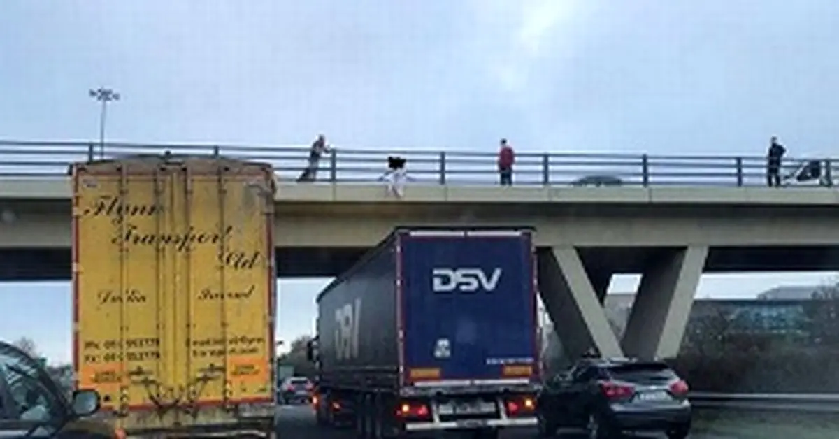 در حالی که سایر رانندگان نگران بودند هر لحظه این دختر خود را به پایین پرت کند این راننده تریلی که هویتش مشخص نشده خود را به زیر پل رساند و خودروی خود را درست در پایین محلی که این دختر آماده پریدن بود پارک کرد. در تصویری که یک شاهد عینی با نام " کیت دون" تهیه کرده این صحنه هیجان انگیز را نشان میدهد. کیت در گفتوگو با Irish Mirror گفت: « این زن قصد پریدن از بالای پل به پایین را داشت اما عکس العمل قهرمانانه این راننده تریلی مانع این اتفاق شد. همه قهرمانان کلاه بر سر ندارند. لطفا به همه بگویید این وقت سال زمان مناسبی برای آنکه شما به زندگی خود پایان دهید نیست( سال جدید خانواده و اطرافیان خود را خراب نکنید).»