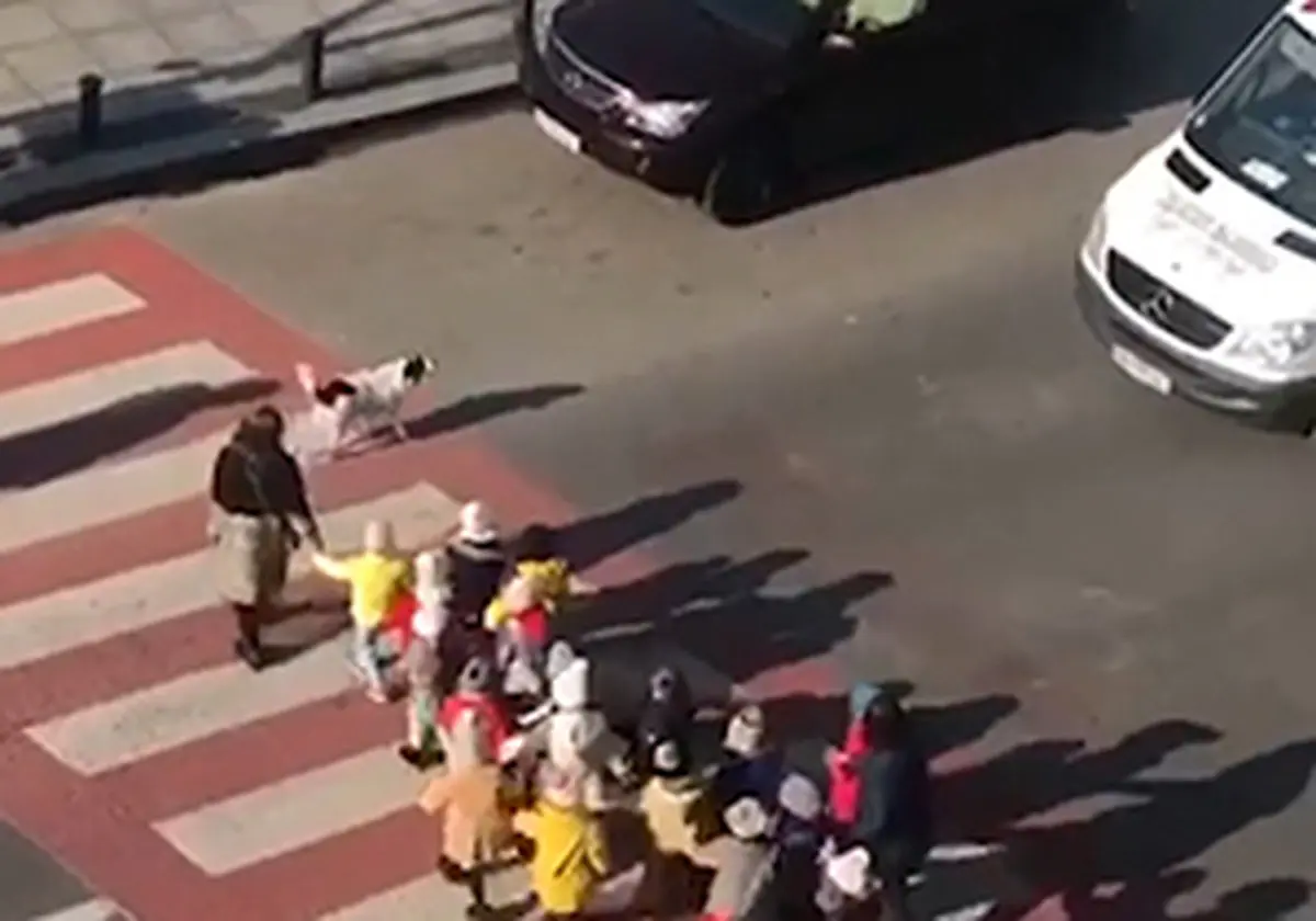 ویدیویی که از این اتفاق منتشر شده نشان می دهد سگ مهربان تلاش میکند تا مانع نزدیک شدن خودروها به خط عابر پیاده شود تا کودکان بتوانند با آرامش از خیابان عبور کنند.