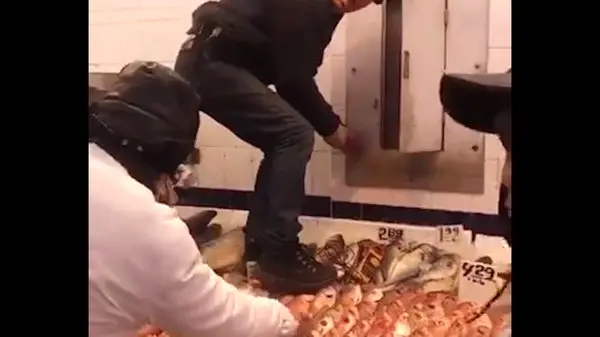در ویدیو منتشر شده نشان می دهد که برق کار چینی بدون توجه به رعایت بهداشت روی ماهی های یخ زده فروشگاه لگد می کند و بدون توجه به حضور مشتریان برق محوطه را درست می کند.