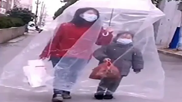 در این ویدیو نشان می دهد که یک مادر و دختر در چین برای مصون ماندن از ویروس کرونا با بستن یک مشمع بزرگ به چتر برای خود یک محافظ درست کردند تا به ویروس کرونا مبتلا نشوند.
