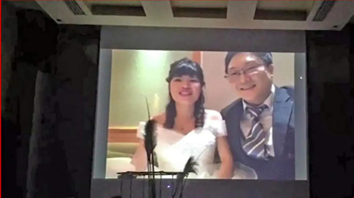 این زوج از خانواده و اقوام خود خواستند تا در یک سالن مخصوص نمایش تئاتر گرد هم بیایند تا آنها را در برپایی جشن بهترین روز زندگی شان همراهی کنند. پس از حضور مهمانان در محل آنها از طریق اینترنت و به صورت زنده مراسم ازدواج خود را بر روی یک نمایشگر در سالن پخش کردند و به این ترتیب بهترین روز زندگی خود را جشن گرفتند. در یکی از تصاویری که منتشر شده است مهمانان زیادی را که در سالن برگزاری جشن حضور دارند نشان میدهد. در تصویر دیگر عروس و داماد جوان در هنگام پخش زنده از طریق اینترنت دیده میشوند.