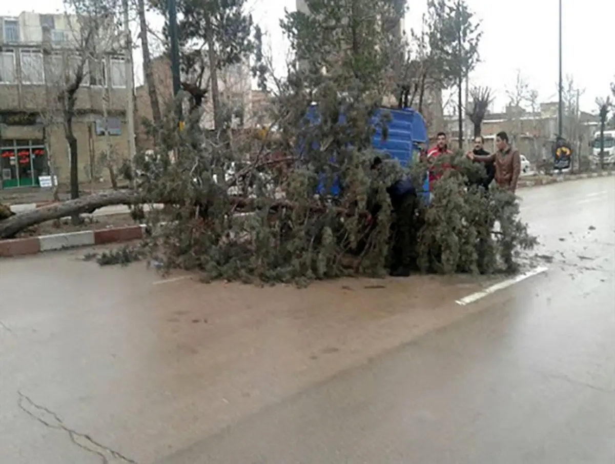 کنده شدن درختان همدان و ایستگاه اتوبوس در اثر باد+ عکس