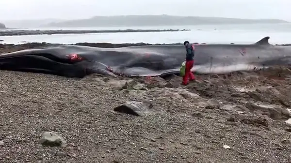 در این ویدیو نشان می دهد که نهنگی غول پیکر که هنوز نیمه جان است در ساحل دریا افتاده و امدادرسانان سعی بر نجات او دارند اما با وجود تلاش مردم نهنگ در ساحل جانش را از دست داد.