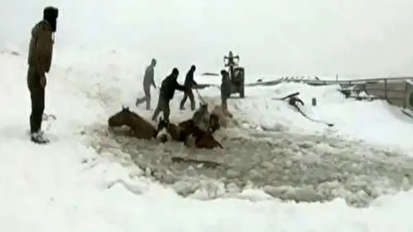 نجات یک گله اسب از داخل رودخانه یخ زده + فیلم