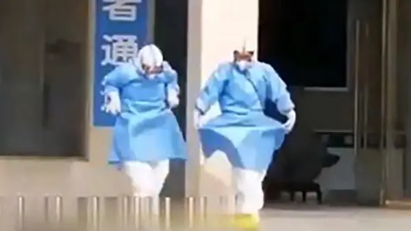 حوادث رکنا: پزشک چینی پس از درمان پند بیمار کرونایی در بیمارستان اقدام به شادی کرد.