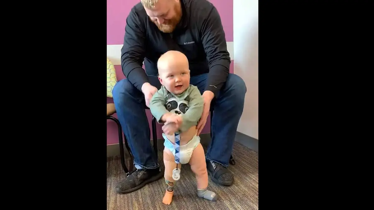 در ویدیو منتشر شده نشان می دهد پسربچه اهل مینه سوتا که از بدو تولد با یک پا به دنیا آمد پس از ساخت یک پروتز توانست روی پایش بایستد و با کمک پدرش قدم بردارد و خوشحالی کند.