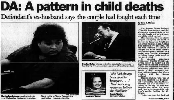 مارتا آن جانسون بین سالهای ۱۹۷۷ تا ۱۹۸۲، سه تن از فرزندانش را خفه کرد و هر یک از این قتلها بدنبال درگیری و نزاع با شوهرش رخ میداد. هر باری که شوهرش خانه را ترک میکرد، یکی از فرزندان آنها جانش را از دست میداد. در سپتامبر ۱۹۷۷، جانسون ۲۱ ساله و سومین شوهرش در کنار فرزندان جانسون از ازدواجهای قبلی اش زندگی میکردند. مدت کوتاهی پس از آن که شوهر وی به دنبال یک درگیری خانگی، آنجا را ترک کرد، جانسون فرزند ۲ ساله اش را به بیمارستان رساند و بعد از اعلام مرگش، پزشکان علت آن را سندرم مرگ ناگهانی کودک ثبت کردند. در ادامه جانسون و شوهرش آشتی کرده و صاحب دو فرزند دیگر شدند.