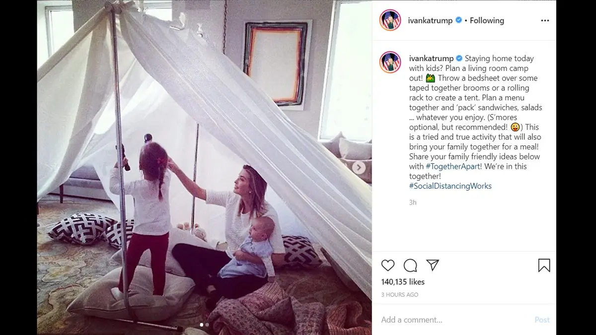 حوادث رکنا: دختر دونالد ترامپ با انتشار تصویر اینستگرامی اش وضعیت کنونی خود با فرزندانش را در قرنطینه خانگی به تصویر کشید.