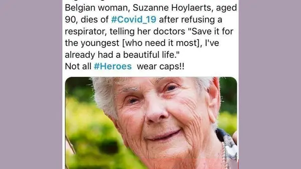 حوادث رکنا : یک پیرزن در بلژیک که کرونا گرفته بود از پزشکان خواست که دستگاه تنفس او را به جوان ها بدهند.