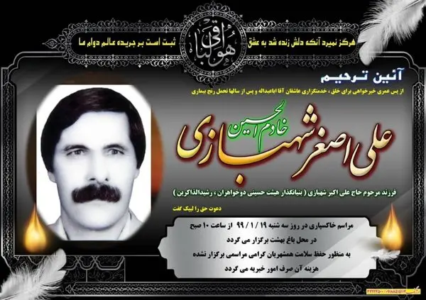 او فرزند ارشد مرحوم حاج علی اکبر شهبازی از بنیان گذاران هیئت دوخواهران است که سینه مرحوم شهبازی صندوقچهای از ناگفتههای باارزش درخصوص تاریخ معاصر نهاوند است که فردای نهاوند چندی پیش در شماره ۱۵۲ خود با مرحوم به گفت و گو نشست و بخشی از آن را برای همیشه در صفحه نشریه به یادگار گذاشت.