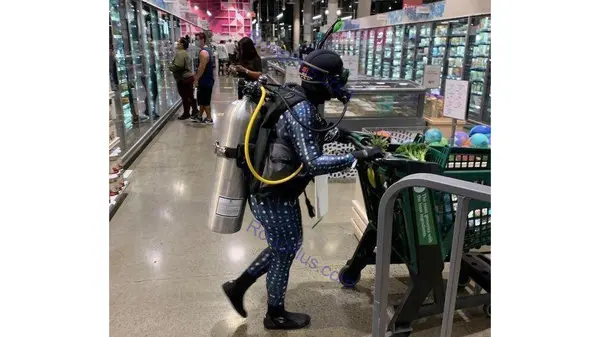 خرید با لباس غواصی برای محافظت در برابر کرونا+عکس