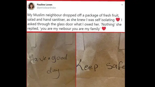 بر اساس گزارش رسانه های خارجی، زن مسلمان زمانی که متوجه شد همسایه اش در قرنطینه خانگی به سر می برد توانایی بیرون رفتن از خانه و خرید مایحاتاجش را ندارد بسته ای شامل میوه تازه، سالاد و مواد ضد عفونی کننده از پنجره برایش فرستاد.