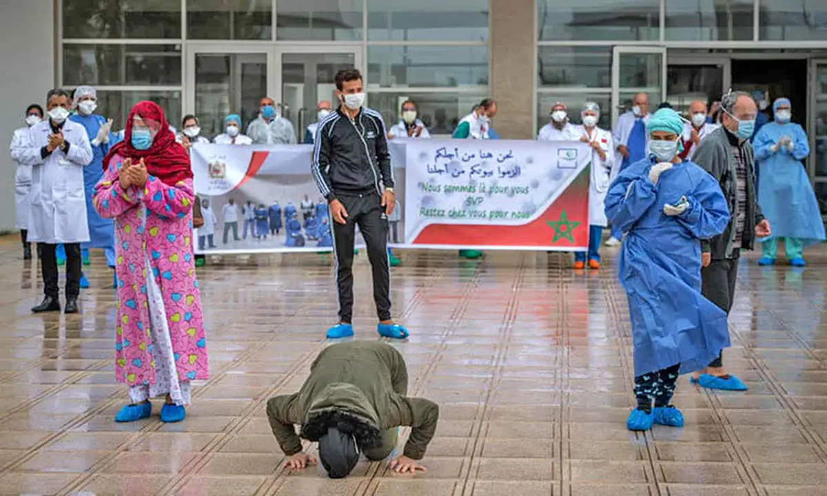 حوادث رکنا: بیمار مبتلا به کووید-۱۹ در یکی از بیمارستانهای پایتخت مغرب پس از مرخص شدن در میان تشویق پرستاران و پزشکان بر زمین سجده کرده است.