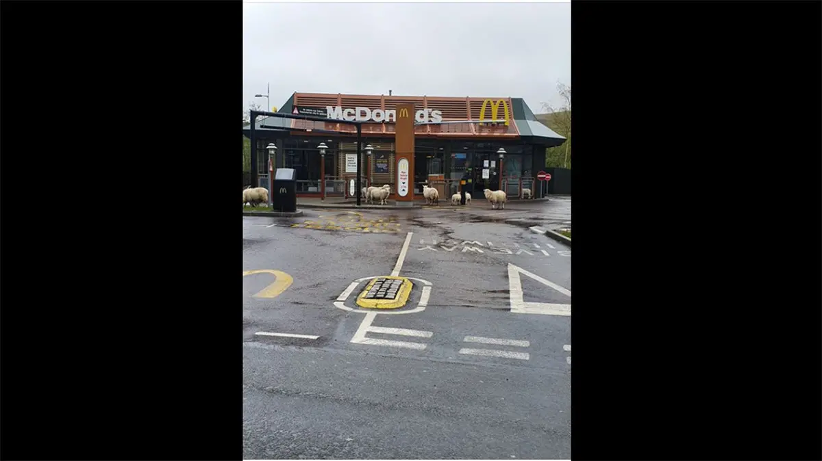 در تصویر نشان می دهد که در بریتانیا، گوسفندان در ایستگاه اتوبوس در مقابل رستوران به صف ایستادند و در بحران قرنطینه به خیابان ها آمدند.