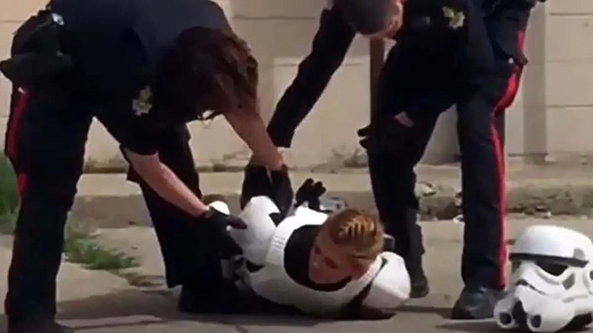 حوادث رکنا: چند پلیس کانادا به روی دختری که لباس شخصیت فیلم «جنگ ستارگان» برتن داشت اسلحه کشیده و بینی اش را خون آلود کردند.