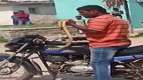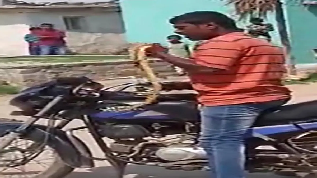 در ویدیو منتشر شده نشان می دهد که یک جوان هندی که سوار بر موتورسیکلت نیز بوده یک مار زنده را خورد.