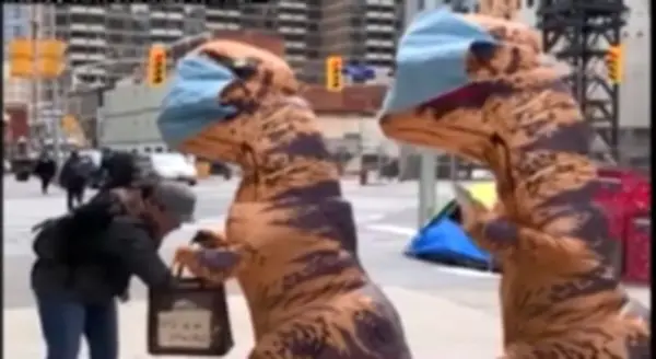 حوادث رکنا: یک مادر و دختر کانادایی با پوششی شبیه دایناسورها، بین شهروندان تورنتویی ماسک رایگان توزیع کردند.