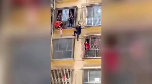 در ویدیو منتشر شده نشان می دهد که یک کودک پس از رفتن به داخل بالکن ناگهان از میان حفاظ آهنی به پایین سقوط کرد و به طرز وحشتناکی از ناحیه گردن در هوا آویزان ماند.