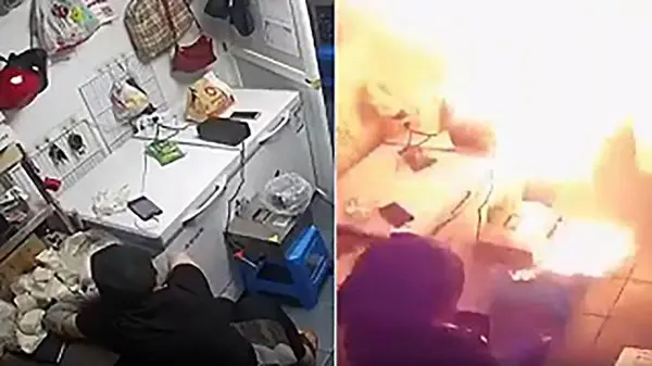 در ویدیو منتشر شده نشان می دهد که یک زن در آرامش و با خیال راحت در گوشه آشپزخانه یک ساختمان مسکونی نشسته که صدایی مهیب و آتش و دود او را غافلگیر کرد.