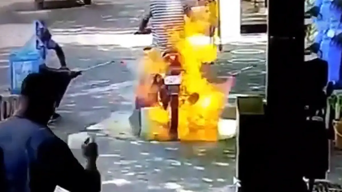 به گزارش فرارو، این حادثه در احمدآباد هند رخ داده و موتورها ملزم به عبور از یک ایست و بازرسی که اقدام به ضدعفونی وسایل نقلیه می کند هستند اما پس از پاشیدن مواد ضدعفونی روی یکی از موتورها آتش سوزی رخ داد.