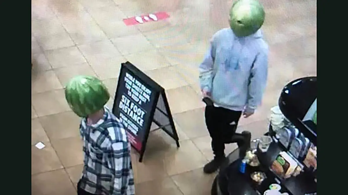 این دو سارق برای سرقت از یک فروشگاه، تصمیم گرفتند کلاه‌های عجیبی را روی سر خود بگذارند تا شناسایی نشوند. آن‌ها هندوانه‌ای را انتخاب کردند و محتویاتش را بیرون آوردند و با ایجاد دو سوراخ برای دیدن، پوسته را روی سرشان گذاشتند.