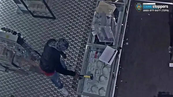 در این ویدیو نشان می دهد که دو سارق در حال شکستن ویترین جواهرفروشی هستند که پس از مدتی موفق به سرقت جواهراتی به ارزش 29000 دلار ، وسایل الکترونیکی و بطری های آب از این جواهرفروشی شدند.