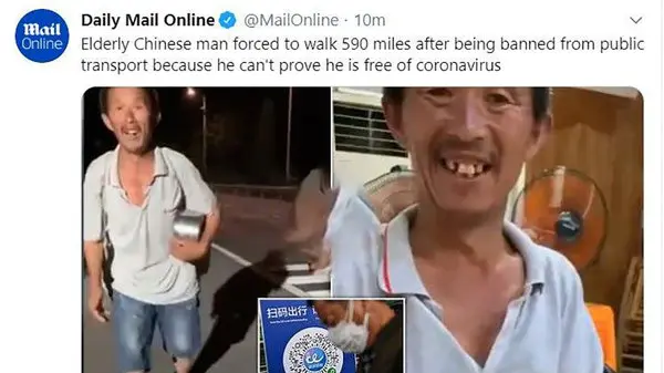به گزارش رکنا،آقای چینی به نام Ge دوهفته را به صورت پیاده طی مسیر کرد،چرا که QR کد بهداشتی نداشت و نتوانست اثبات کند که کرونا ندارد.شهروندان چینی باید اپلیکیشن ردیاب کرونا روی گوشی خود داشته باشند.