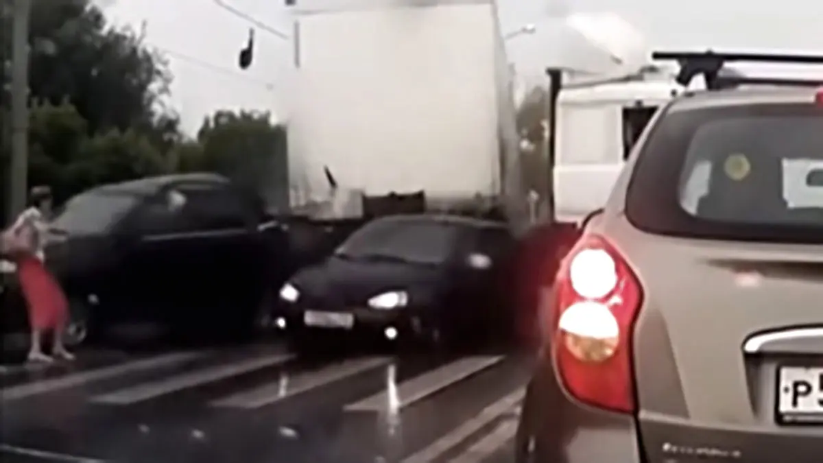 فیلم لحظه وحشتناک پرتاب شدن یک زن در تصادف زنجیره ای / روسیه