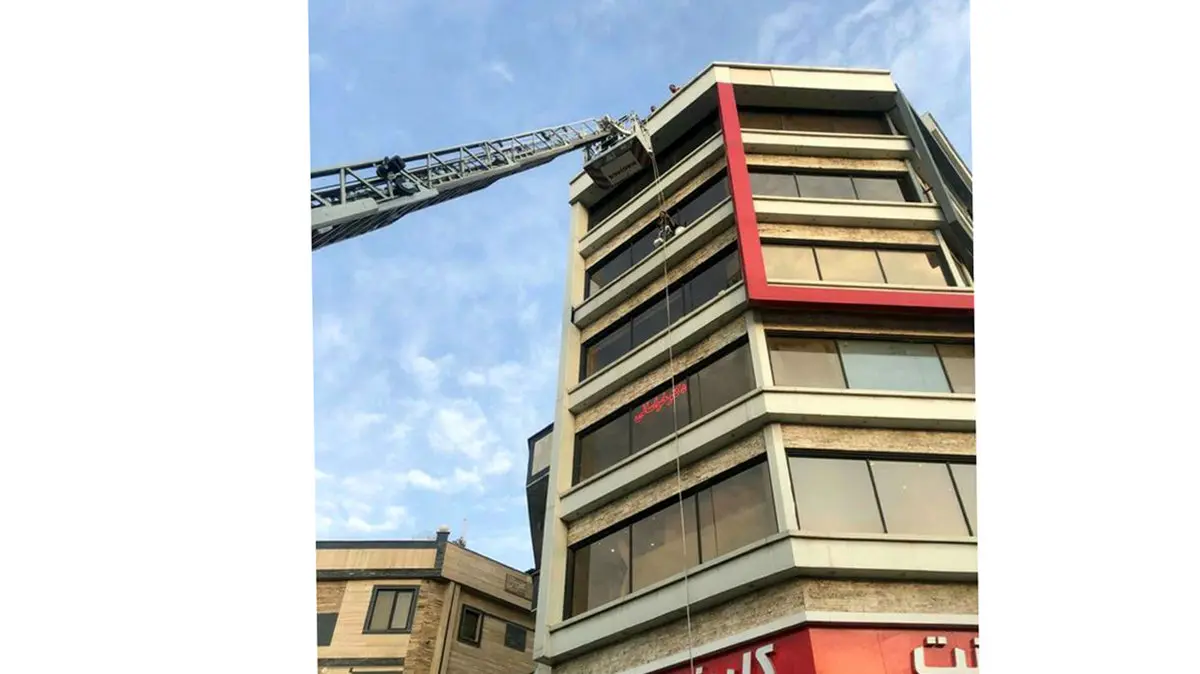 حوادث رکنا : یک کارگر جوان روی نمای ساختمانی در خیابان پیروزی تهران گیرافتاد.