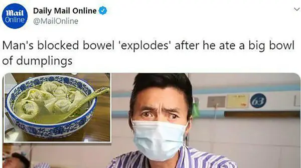 به گزارش رکنا، وی در حال خوردن شام مورد علاقه خود، دامپلینگ بود که صدای انفجار را شنید. سپس احساس درد شدید در شکم کرد و در بیمارستانی در هوان در شرق چین بستری شد. پزشکان ۳ هزار میلی لیتر مواد تجمیع شده در سیستم گوارش وی را بیرون کشیدند!
