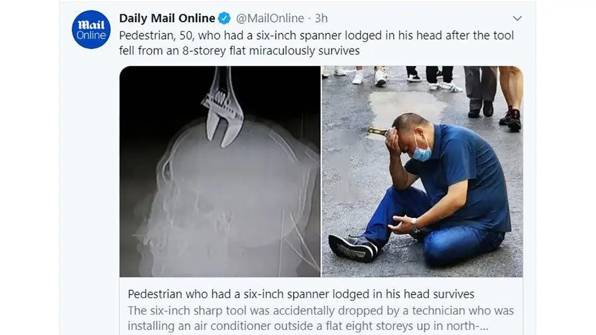 بنا به گزارش رسانه های خارجی ، این مرد در خیابان در حال عبور بود که ناگهان آچار فرانسه یک تعمیرکار کولرگازی از طبقه هشتم ساختمان از دستش رها شده و روی سر وی افتاد.