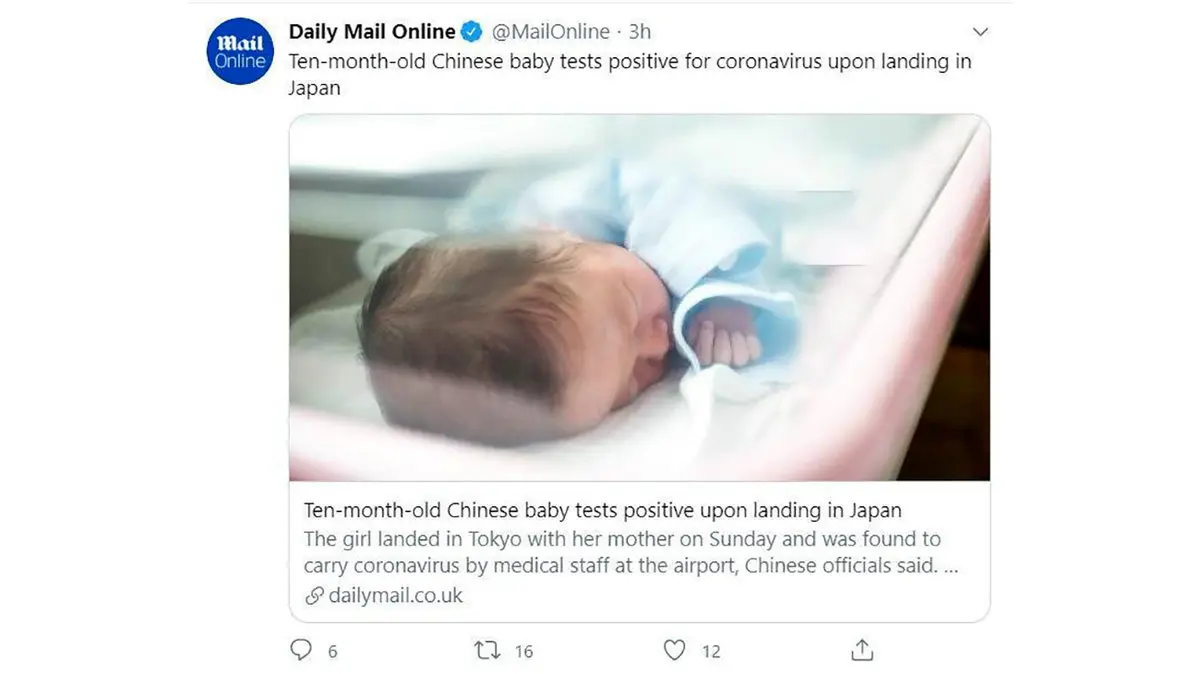 گزارش دیلی میل حاکی از آن است که این کودک 10 ماهه دو روز قبل در چین تست کرونایش منفی شد اما زمانی که وارد فرودگاه توکیو شده تست کرونایش مثبت اعلام شد.