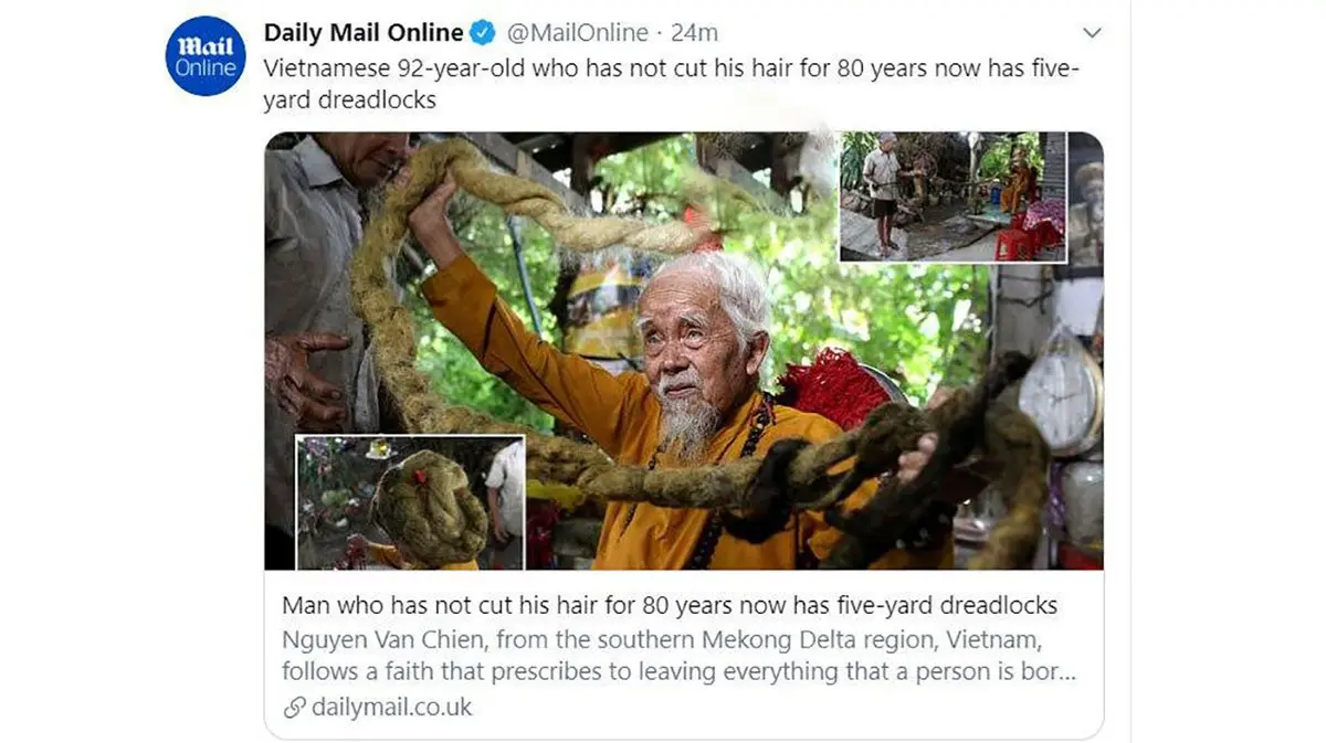 از قرار معلوم ، مرد ویتنامی 80 سال است که موهای خود را کوتاه نکرده و در حال حاضر 4.5 مترو مو دارد.