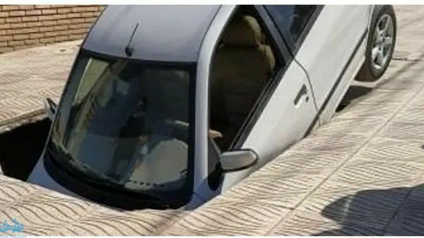 عکس نشست زمین و فرو رفتن سمند پارک شده در پیادهروی بیده میبد یزد حادثه عجیبی را رقم زد.