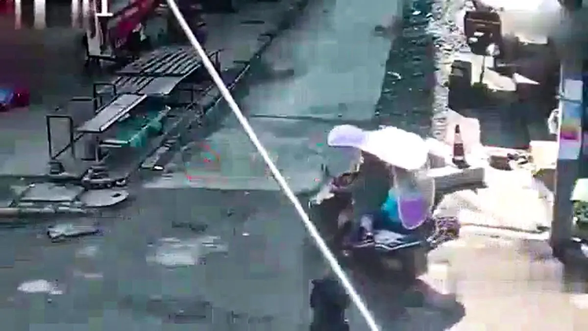 حوادث رکنا: یک موتورسوار در یکی از خیابانهای چین به طرز عجیبی درون یک چاه افتاد.