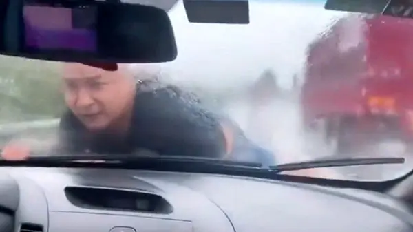 حوادث رکنا: یک مرد چینی که سعی در متوقف کردن اتومبیل همسر سابقش داشت روی کاپوت خودروی او دراز کشید،اما با بی توجهی او مواجه شد.
