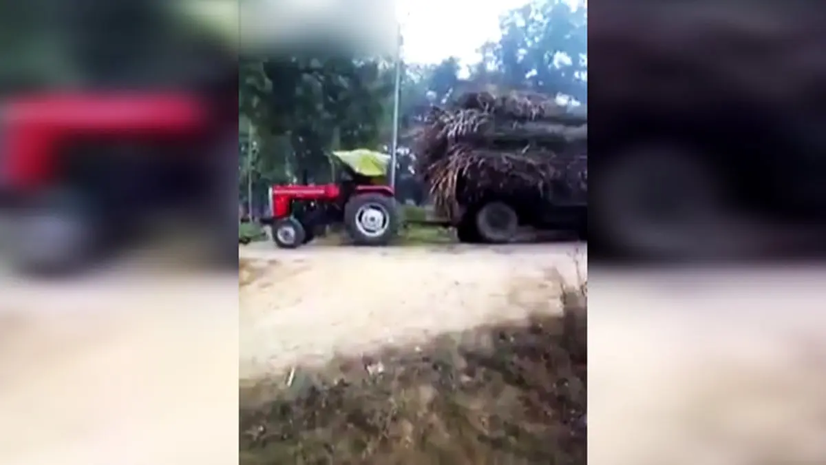 به گزارش رکنا، یک تراکتور در هند که محموله بزرگی از الوار را حمل میکرد از جاده منحرف شد.