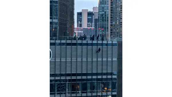 رکنا :در تصاویر و ویدیوی که امروز منتشر شده، مردی دیده می شود که خود را از برج ترامپ در شیکاگو و با استفاده از یک طناب آویزان کرده است.