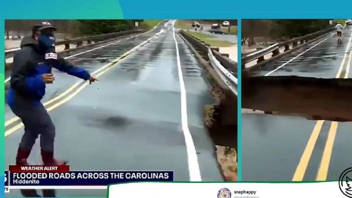 مانند اتفاقی که به تازگی برای یک خبرنگار آمریکایی حین گزارش زنده تلویزیونی رخ داد و چیزی نمانده بود به مرگ وی منجر شود. «آمبر رابرتز»، خبرنگار فاکس ۴۶ در حال گزارش زنده از وقوع سیل از روی پل «هیدنیت» در منطقه الکساندر واقع در کارولینای شمالی بود که ناگهان قسمتی از پل فرو ریخت.