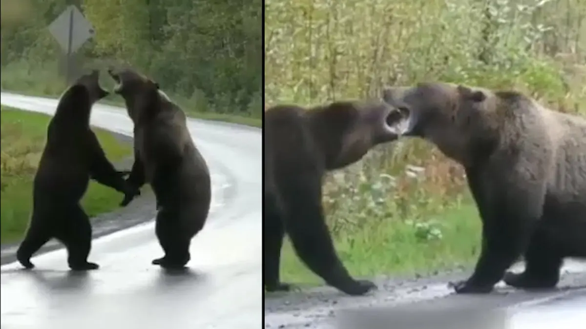 جدال دو خرس گریزلی با یکدیگر  وسط جاده ! + فیلم