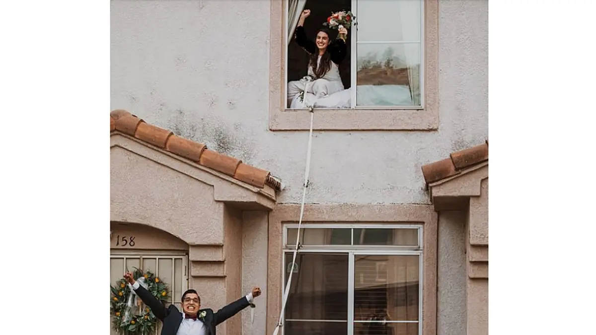 به گزارش گروه ترجمه رکنا، مراسم ازدواج زوج عاشق پیشه آمریکایی از پنجره اتاق خواب عروس برگزار شد.