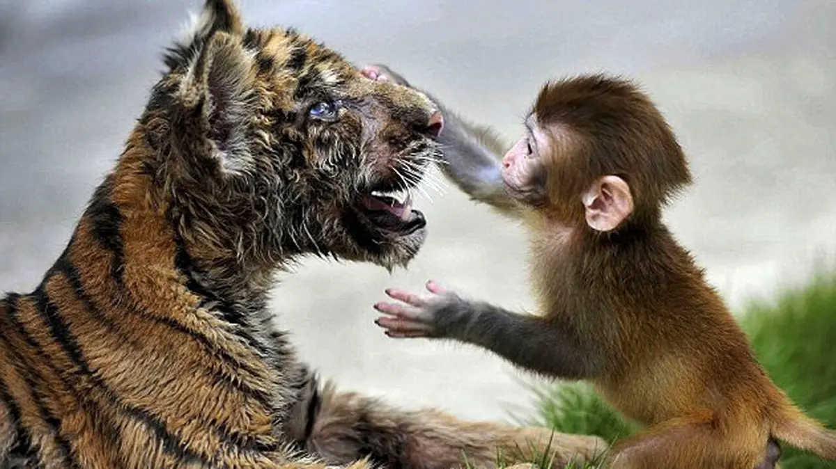 شوخی خطرناک میمون با دو ببر گرسنه + فیلم