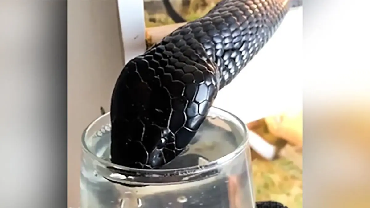 فیلم باورنکردنی از یک مار سیاه که با لیوان آب میخورد