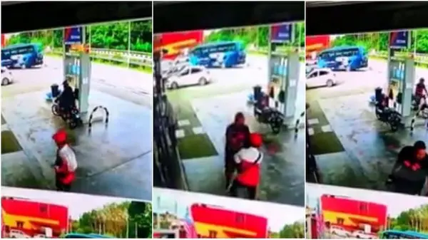 این موتورسوار پس از آنکه مقداری بنزین روی لباسش ریخت اقدام به ضرب و شتم این کارگر بیچاره کرد. ظاهرا متصدی پمپ بنزین در حال کمک به این موتورسوار برای پرکردن باک موتورسیکلت بود که در لحظه قرار دادن شیلنگ، مقداری بنزین روی این راننده ریخت.