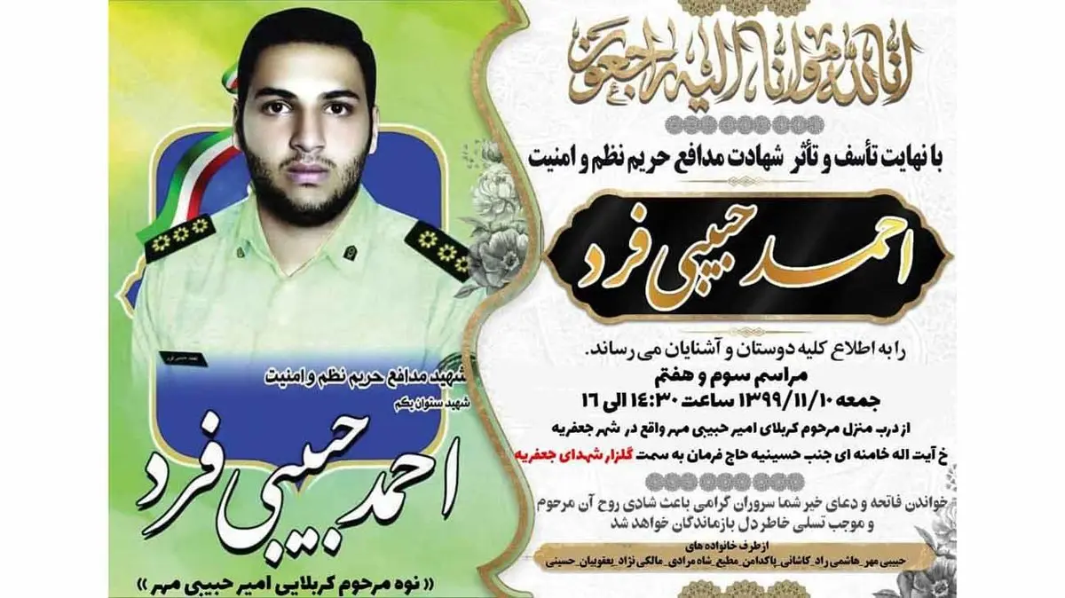 مراسم شهید حبیبی فرد از افسران پلیس در بمپور ایرانشهر که یکم بهمن ۹۹ در درگیری با قاچاقچیان به درجه رفیع شهادت نائل گردید روز جمعه 11 بهمن ماه سال جاری برگزار میشود.