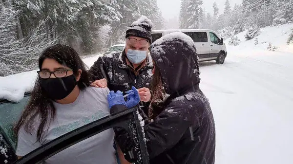 حادثه برای تیم تزریق واکسن کرونا / 6 ساعت سخت در روز برفی + عکس