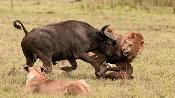 فرار بوفالو از دست شیرها / بچه اش را فدا کرد + فیلم